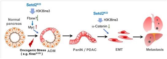 不同病理时期的差异性调节机制,赋予Setd2在复杂疾病中的不同生物学功能,从而更加精准的调控病理过程。本研究首次揭示了SETD2-H3K36me3表观调控元件协同Kras突变在胰腺癌中的功能与分子机制,深入了我们对其病理机制的认识,为胰腺癌靶向治疗提供了新的思路。