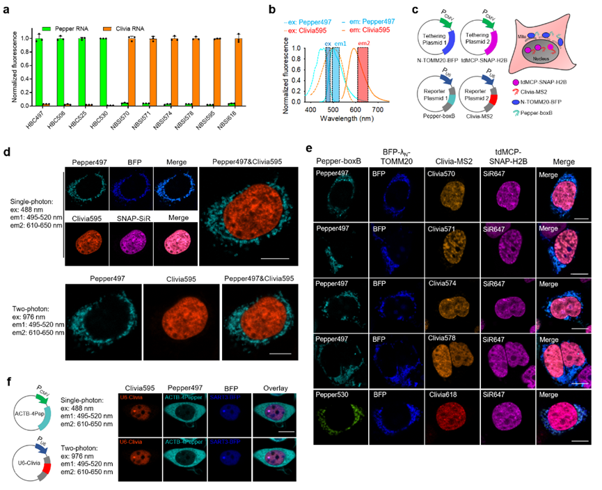 RNA作为遗传物质的传递者,参与细胞生命的整个过程,与多种重大疾病的发生和发展密切相关。RNA示踪是RNA研究的前提,在RNA研究领域,开发能够在活细胞层面使用的RNA成像技术一直是所有研究人员共同追求的目标。其中,荧光成像技术由于其非物理接触、实时原位的技术优势,成为当前RNA研究最重要的手段。尽管针对蛋白的荧光成像技术已经相当成熟,并于2008年获得诺贝尔化学奖,但是这些技术却无法直接复刻用于RNA成像。究其原因,RNA本身结构较小,不稳定,而且表达丰度低,对成像所需时间、信噪比以及探针大小都提出了极为苛刻的要求。因此,目前能够在活细胞层面对RNA进行成像的技术屈指可数,并造成RNA相互作用、功能的研究举步维艰。