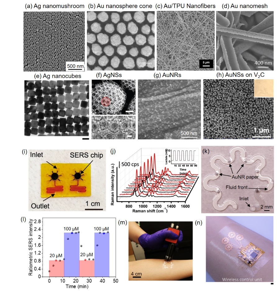可穿戴传感器能够非侵入性地实时监测体液中的生化物质,为早期疾病诊断和个性化健康管理提供了新途径。基于SERS的可穿戴汗液传感器通过利用SERS的高灵敏度和多重检测能力,实现了对电解质、代谢物、激素和药物等多种分子的监测(图4)。