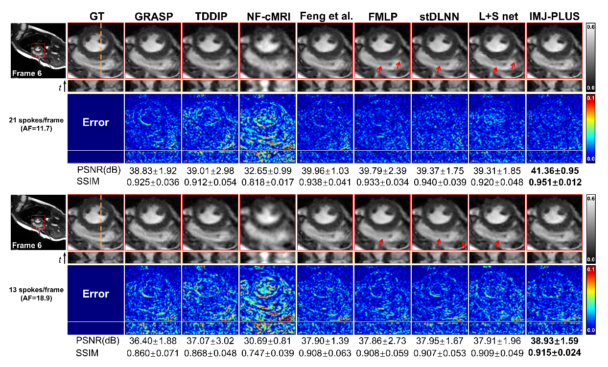 图 2 IMJ-PLUS与其他对比方法在回顾式屏气心脏数据上重建结果示意图。图中分别展示了两种加速倍率(AF=11.7以及18.9)下的重建结果。