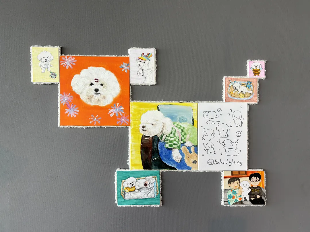 "Bichon Lightning" is based on my pet Bichon Frise, and the eight paintings are in the shape of a puppy. Through a variety of paintings, I not only record Lightning's different adorable looks, but also convey the warmth of my daily life and deep emotions with him. At the same time, combining the paintings into the shape of a puppy is a kind of creative expression, symbolizing that lightning occupies a complete and important position in my life, just like the vivid outline of a puppy, which is indispensable.