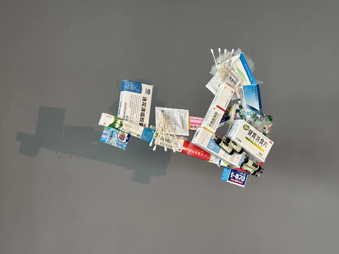 《非处方人生》通过解构日常医疗符号,以回收的废弃药盒为媒介构建了一个充满隐喻的装置作品。艺术家将数百个不同规格、色彩斑驳的药盒进行解构重组,形成具有有机形态的立体拼贴,其表面肌理呈现出一种病态的美学张力。当定点光源投射时,装置在展墙上投射出系列重复的佝偻剪影 — 这些被异化的劳动形象以机械般的韵律排列,与色彩杂陈的药盒本体构成视觉悖论。作品通过医药物资与劳动异化的双重意象并置,尖锐地指涉了当代社会中健康消费主义与生存压力之间的荒诞共生:人们不得不通过药物维系生产力,又在生产过程中持续消耗健康,陷入永动的生存悖论。这种精心设计的视觉辩证法,使观众在光影转换间直观感受到现代性困境中的身体政治。