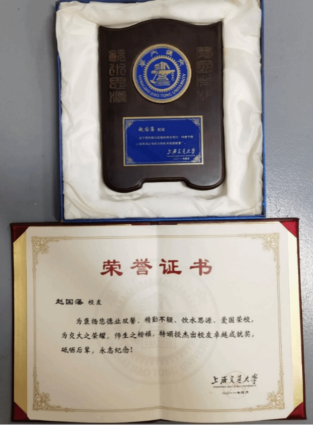 杰出校友卓越成就奖”证书,赵国藩院士对母校的褒奖表示诚挚的感谢,祝愿母校越办越好,早日建成世界一流大学。该照片以及证书此次一并捐赠给交大档案文博管理中心。