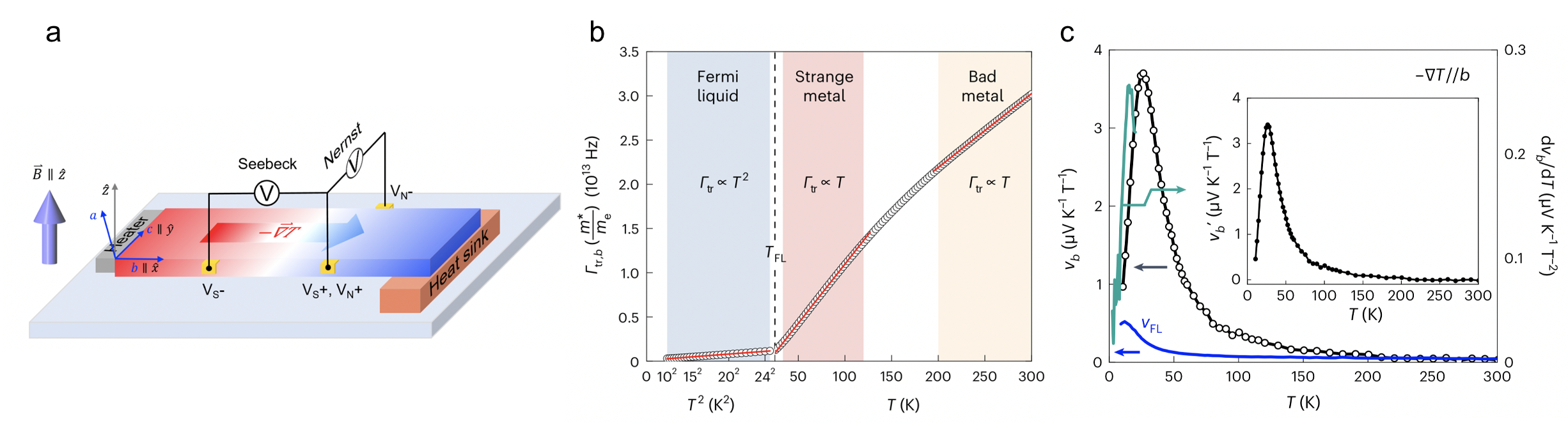 Fig. 1: (a) Schematic of the thermoelectric transport measurement; (b) The phase diagram of the carrier scattering rate in 2M-WS2 as a function of temperature; (c) Temperature dependence of the Nernst coefficient in 2M-WS2. The blue line is the quasiparticle contribution of the Fermi liquid. It can be seen that the Nernst coefficient is significantly enhanced relative to the contribution of the Fermi liquid quasiparticles.