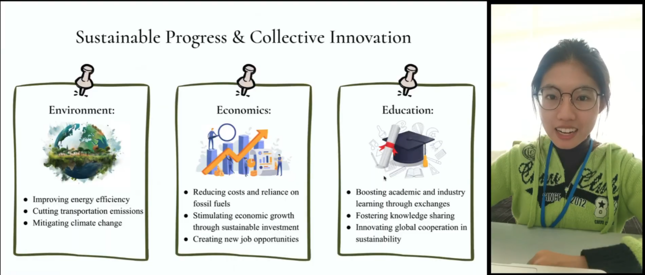 A defining feature of this competition was its unique cross-cultural, interdisciplinary collaboration model, which provided students with a multifaceted exchange platform. Students from diverse majors including engineering, environmental science, foreign languages, and design worked together through hybrid online-offline coordination. They overcame challenges of time zones, language barriers, and cultural differences to engage in profound discussions and cooperation. Participants not only contributed diverse perspectives and innovative thinking grounded in their respective academic backgrounds, but also explored how to integrate knowledge across disciplines through cross-cultural communication. This enabled them to jointly address challenges in renewable energy and green technology faced by both China and the U.S. The intersection of interdisciplinary and cross-cultural thinking not only stimulated team creativity but also demonstrated the wisdom and sense of responsibility of the younger generation in tackling global issues. Through this competition, students enhanced their problem-solving capabilities while gaining a deeper appreciation for the significance of international collaboration. Their unique perspectives and innovative solutions represent valuable contributions to addressing future global challenges.