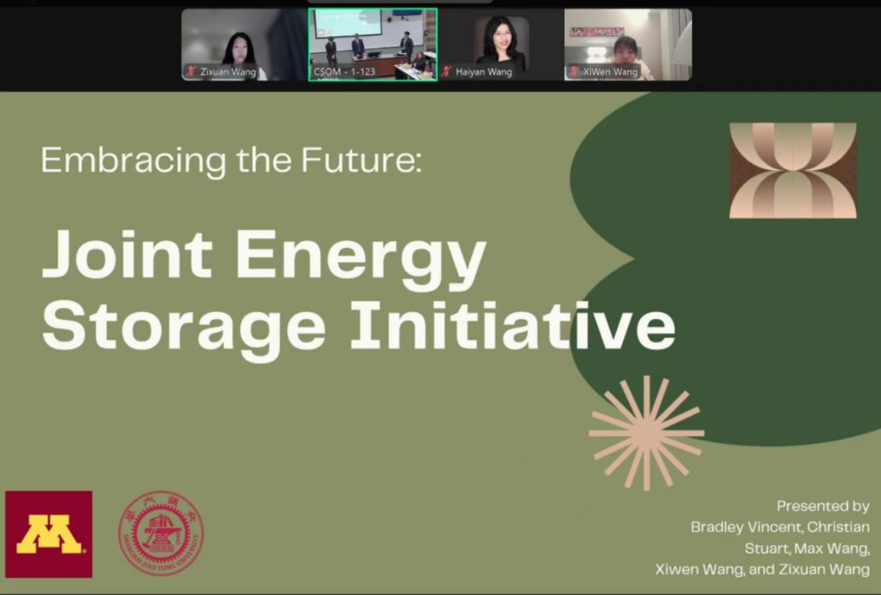A team consisting of Wang Zixuan (School of Foreign Languages) and Wang Xiwen (School of Design) from SJTU, along with Christian Stuart, Max Wang, and Bradley Vincent from the University of Minnesota, developed an innovative joint initiative titled Embracing the Future: Joint Energy Storage Initiative. Focusing on future energy storage technologies, their proposal demonstrated the strong potential of cross-disciplinary collaboration.