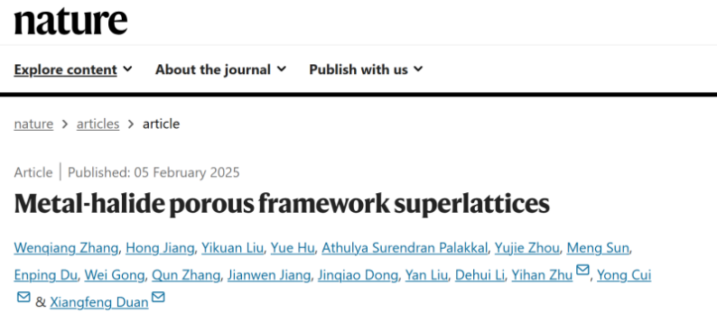 On February 6, 2025, Nature, a top international academic journal, published Metal-halide Porous Framework Superlattices, the research results of Prof. Yong Cui’s team and his collaborators. The School of Chemistry and Chemical Engineering, the Frontiers Science Center for Transformative Molecules and the State Key Laboratory of Metal Matrix Composites of SJTU were the first institutional affiliation of the first author, doctoral student Wenqiang Zhang. Prof. Yong Cui from SJTU School of Chemistry and Chemical Engineering, Prof. Xiangfeng Duan from the University of California,Los Angeles (UCLA), and Prof. Yihan Zhu from Zhejiang University of Technology (ZJTU) are the co-corresponding authors. Prof. Dehui Li from Huazhong University of Science and Technology (HUST), Prof. Jianwen Jiang from the National University of Singapore (NUS), and Prof. Qun Zhang from the University of Science and Technology of China (USTC) provided important support in chiral optics, molecular dynamics simulation, and ultrafast spectroscopy experiments, respectively.