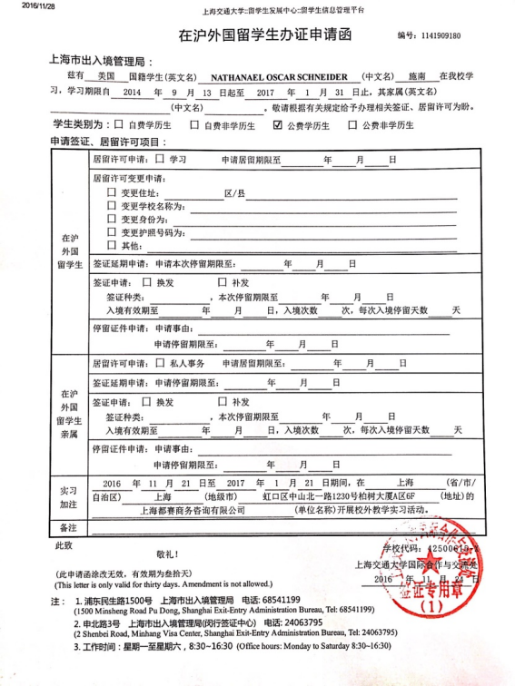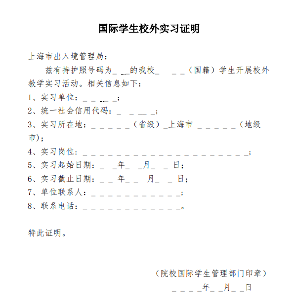 3. Ten Business days after the International Student Development Center submits the materials to the Shanghai Exit-Entry Administration Bureau, if no issues are reported, the department should promptly collect the feedback documents from Ms. Zhao Dinghui at the International Student Development Center. These documents include the Off-Campus Internship Verification Form for International Students, the Internship Certificate for International Students, and the Application Letter for Foreign Student Visa Issuance in Shanghai issued by the university’s Exit-Entry Service Center. As the letter issued by the Exit-Entry Service Center is valid for only 30 days, the responsible department staff should collect the documents as soon as possible.