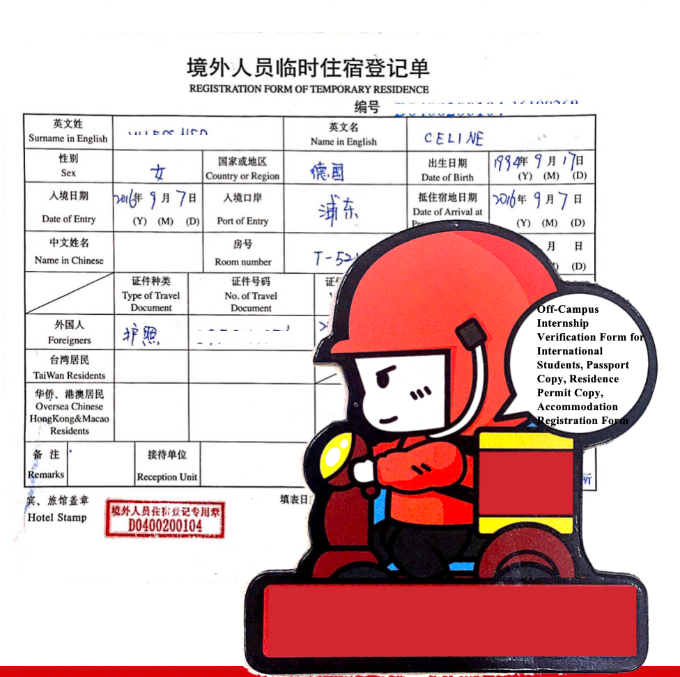 The department should submit the hard copies of the Off-Campus Internship Verification Form for International Students, along with the student’s passport copy, residence permit copy, and accommodation registration form, to Ms. Zhao Dinghui at Room 206, International Center, Donghui Garden, Minhang Campus