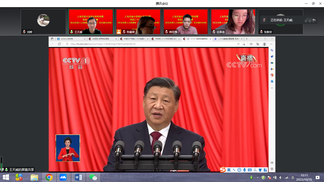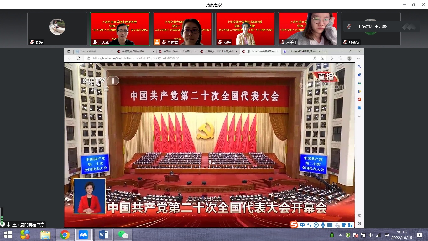 2022年10月16日上午10时,人力资源处(教工部)党支部全体党员在线集体收看中国共产党第二十次全国代表大会直播,全程收听了习近平总书记代表第十九届中央委员会作的题为《高举中国特色社会主义伟大旗帜,全面贯彻新时代中国特色社会主义思想,弘扬伟大建党精神,自信自强、守正创新,踔厉奋发、勇毅前行,为全面建设社会主义现代化国家、全面推进中华民族伟大复兴而团结奋斗》的主题报告。