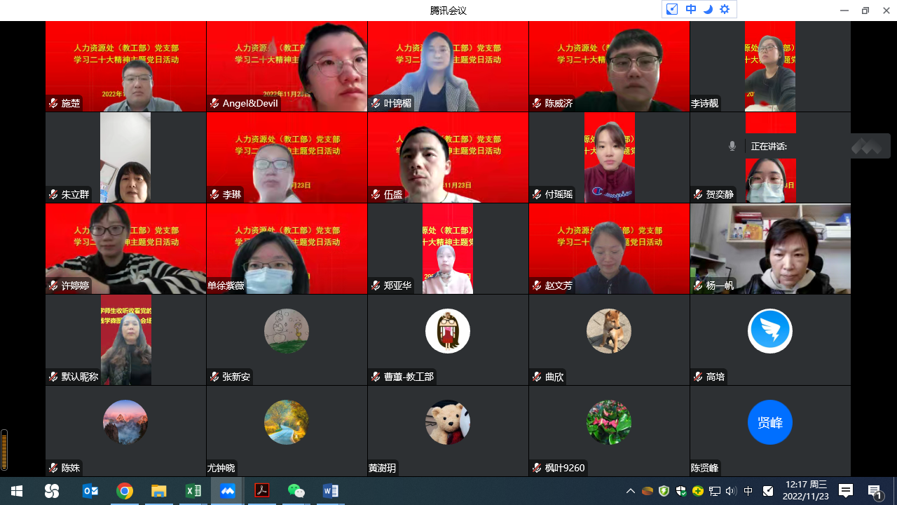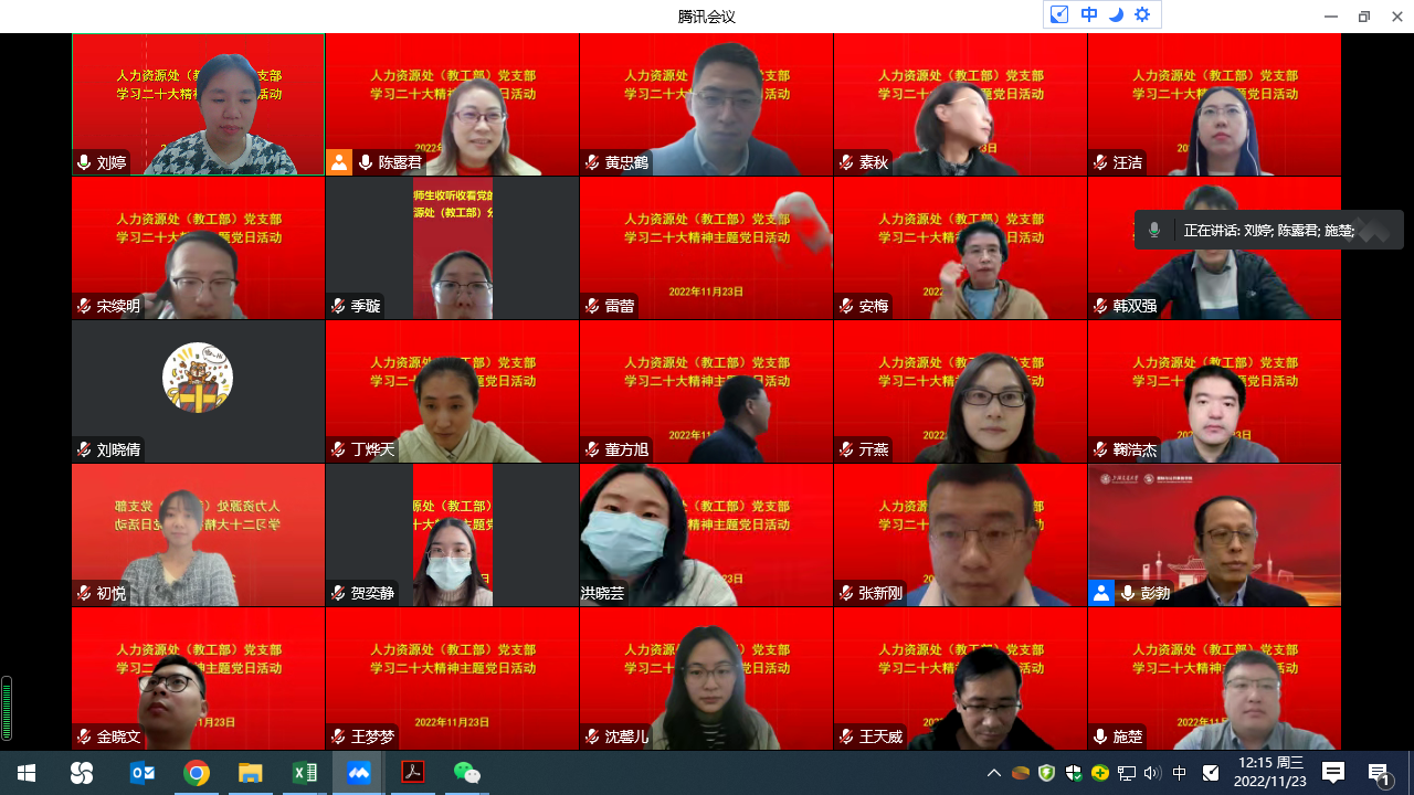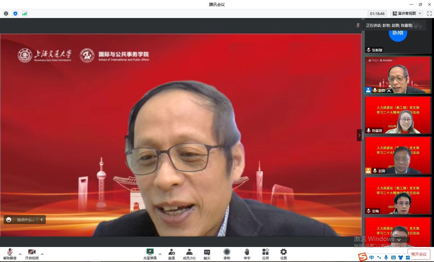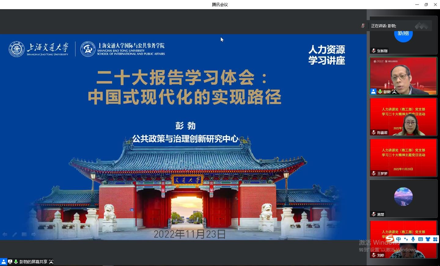 为深入学习贯彻党的二十大精神,人力资源处(教工部)于2022年11月23日中午,线上召开二十大精神学习主题党日活动。会议邀请开云网页登录 国际与公共事务学院的彭勃教授作专题讲座,人力资源处(教工部)全体党员参加活动。