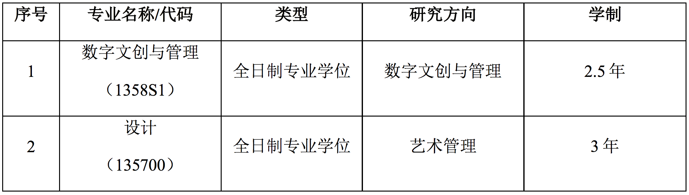 注:根据《国务院学位委员会关于下达有关学位授权点对应调整名单的通知》(学位【2023】13号)、教育部《关于做好2024年研究生招生专业目录编制工作的通知》(教学司【2023】)等文件精神和要求,文创学院原“艺术”硕士(艺术管理方向)(代码:135100)名称相应变更为“设计”硕士(艺术管理方向)(代码135700)。