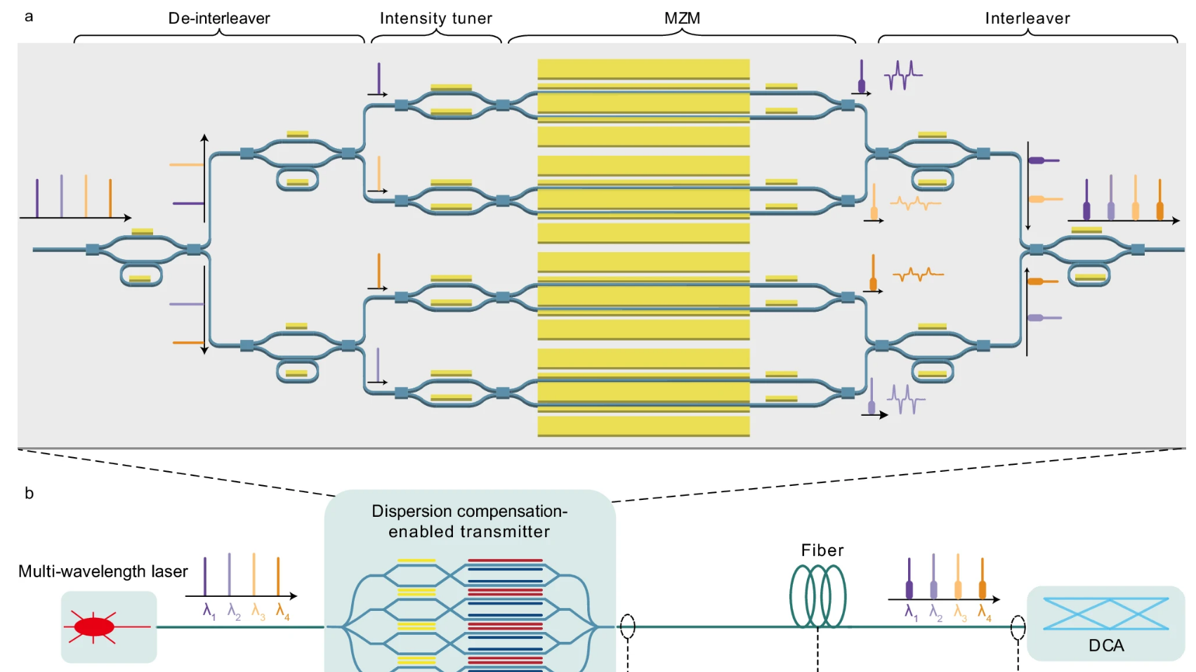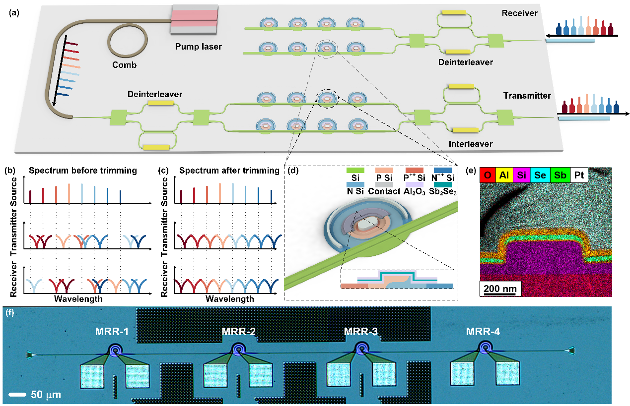 集成电路学院(信息与电子工程学院)周林杰教授团队陆梁军副教授和李雨副教授通过将低损耗相变材料Sb₂Se₃与硅基微环谐振器异质集成,首次实现了近零功耗“现场可编程”光收发芯片。对微环中的PN结施加电脉冲触发相变,实现了精度达10皮米、超一个自由光谱范围的非易失波长调谐,在满足微环阵列波长校准需求的同时有效消除了状态维持功耗。研究团队还提出了一种创新反馈机制来抑制温漂,成功演示了4通道可编程微环阵列的高速收发,传输速率达到400Gbps。相关研究成果以“Field Programmable Silicon Microring WDM Transceiver Leveraging Monolithically Integrated Phase-Change Materials”(基于相变材料异质集成的非易失现场可编程微环阵列光收发芯片)为题,发表在《PhotoniX》上。