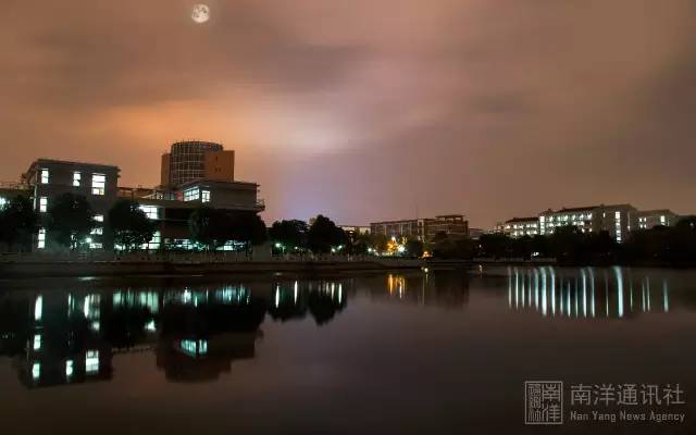 从思源湖看明月,湖中灯光的倒影似璀璨的水晶帘有琉璃的五彩,有黄玉的夺目,衬得月光耀眼无比。