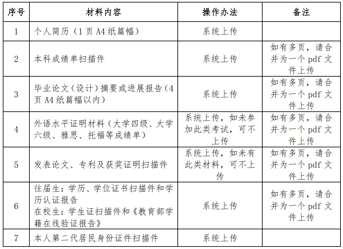 3.资格审查:请考生准备好身份证原件、学生证原件(在校生)/学历学位证原件(往届生)供查验。原件请不要和上述第2条材料放在一起,第2条的材料1-7上交学院后,学院不再返回考生。