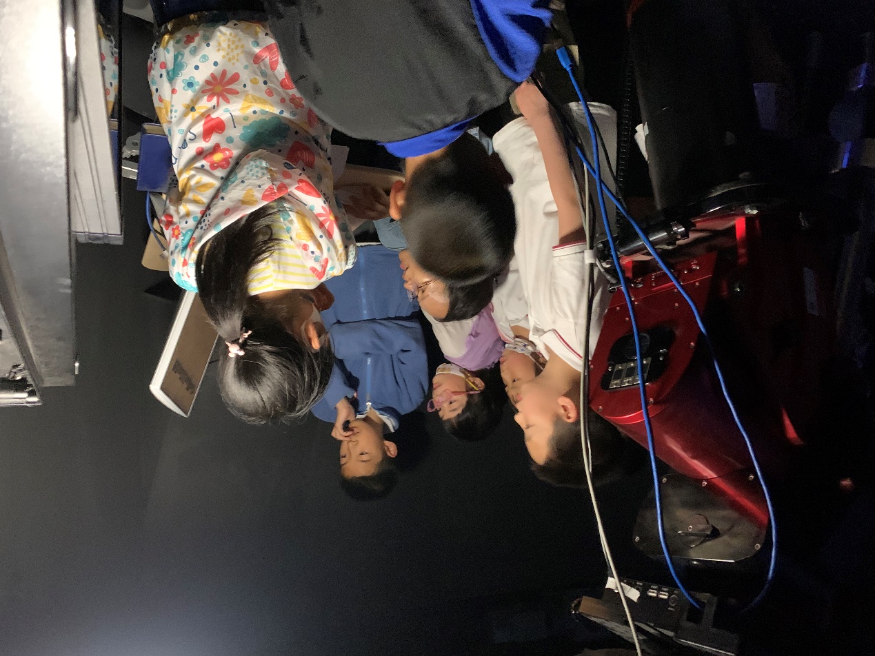 晚饭后,大家带着孩子们陆陆续续来到物理与天文学院,乘电梯抵达8层,打开一扇铁面,便进入了一片星月童话世界。天台上视野开阔、微风轻徐,令人舒心,夜幕降临前,霍英东体育中心等交大标志性建筑尽收眼底。天台中间便是神秘的天文望远镜小圆屋,孩子们登上小圆屋台阶,不约而同地放声高歌起来。天黑后黄老师开启了它的小侧门和上顶,孩子们拥进了小圆屋,一览庞大的天文望远镜。黄老师和天文系同学向孩子们介绍了望远镜的结构和原理,并展示了所拍摄的土星、木星和月亮等高清图片,介绍了它们的特点。孩子们踊跃发言和提问,有小朋友特别喜爱带环状的漂亮土星,并表示将来想成为天文学家。
