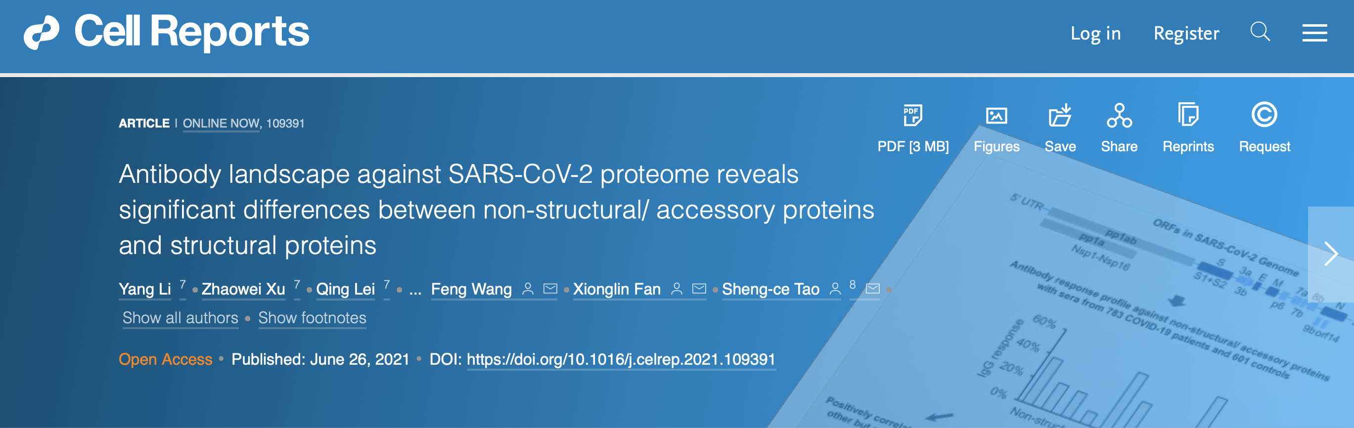 2021年6月26,Cell Reports在线发表了由开云网页登录 陶生策团队、华中科技大学范雄林团队、华中科技大学附属同济医院的汪峰/孙自镛团队合作的研究成果“Antibody landscape against SARS-CoV-2 proteome reveals significant differences between non-structural/ accessory proteins and structural proteins”。这项工作基于此前开发的新冠病毒蛋白质组芯片(链接到Bioart:陶生策团队合作开发SARS-CoV-2蛋白质组芯片全局性分析新冠病人血清IgG&IgM应答)筛选了2360例新冠病人血清和601例对照血清,系统地描绘了新冠病毒非结构蛋白的抗体响应的强度、动态变化以及与疾病的相关程度,发现非结构蛋白的抗体反应模式与结构蛋白存在显著差异。
