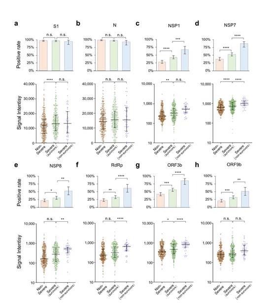 图3. 蛋白抗体响应同疾病严重程度相关。a-h.不同病人组别(轻症,重症和死亡)中,各蛋白抗体阳性率(上)及抗体响应水平(下)。
