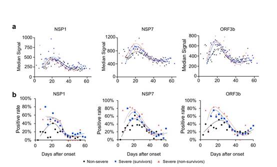 图4. 非结构蛋白抗体响应的动态变化。a-b.根据发病时间(day)统计各病人抗体水平的平均值(a)及阳性率(b)并绘制趋势线。不同颜色分别代表不同组别病人。