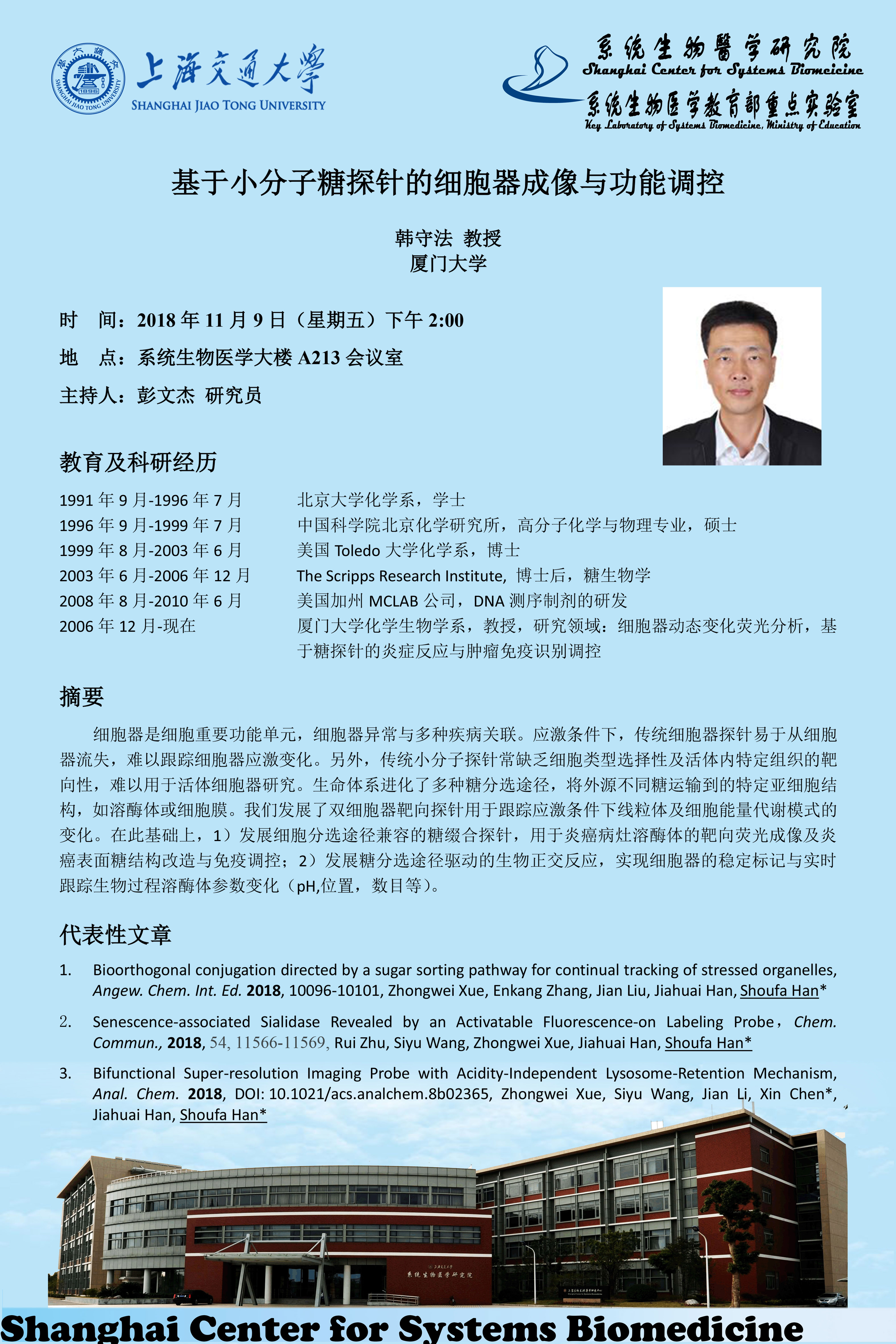 韩守法教授于1996年本科毕业于北京大学化学系,于2003年获得Toledo大学化学系博士学位,随后于2003-2006年加入The Scripps Research Institute做博士后研究。再于2006年加入厦门大学化学生物学系担任教授。韩教授课题组的研究方向为疾病关联细胞器分析与功能调控和基于糖探针的炎癌的免疫识别调控。