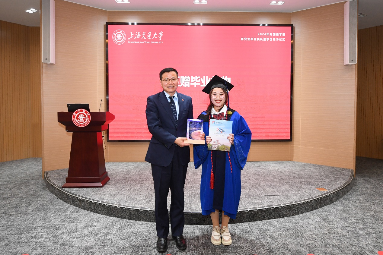 During the gift-giving session, Ding Jian, on behalf of the SFL, presented the graduate souvenir book to the graduates, showing the SFL's intention to accompany and concern about everyone's growth, and also the hope that the students will remember the wonderful time spent in the SFL. On behalf of the graduates, Li Zhenni presented to the SFL a crystal monument engraved with the thesis titles of all the 2024 graduates, which represented the students' years of arduous study and the teachers' years of sincere teaching.