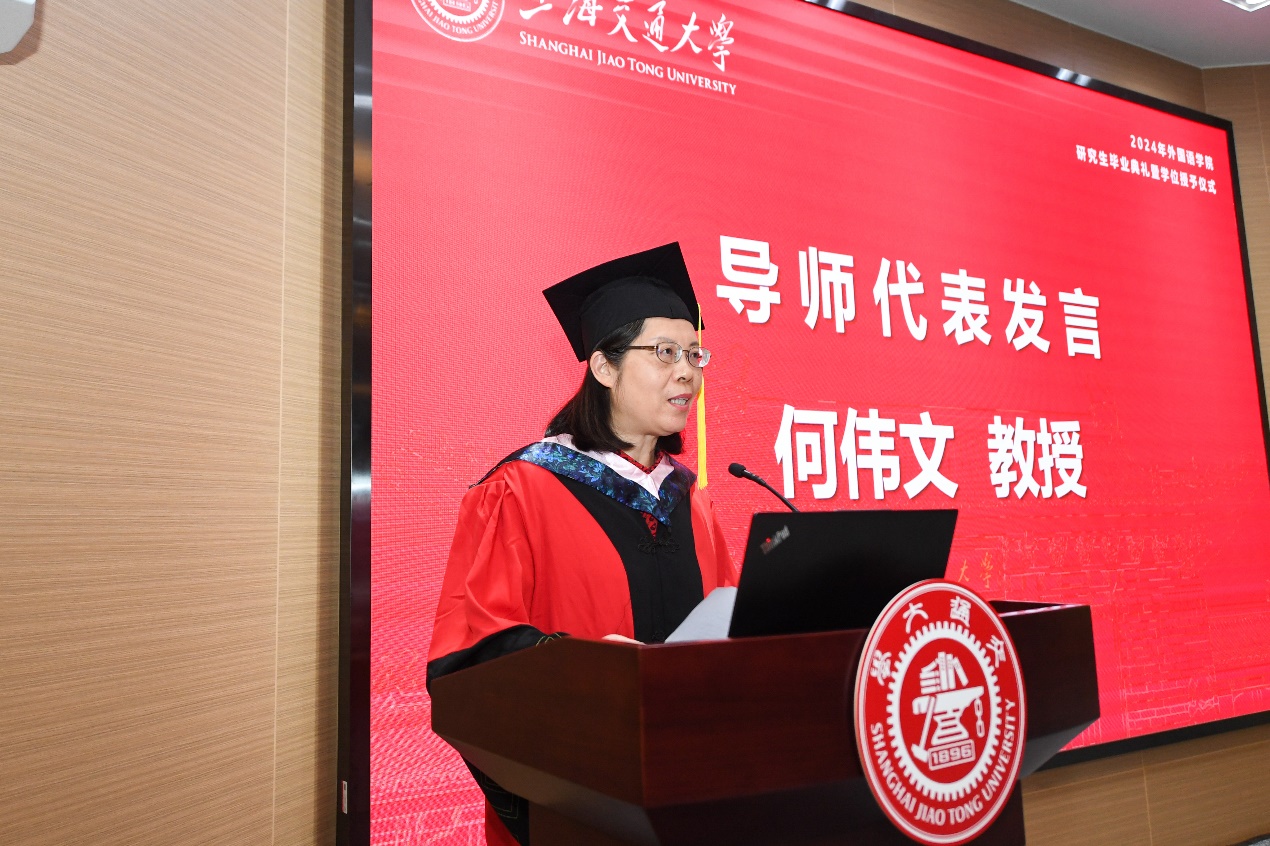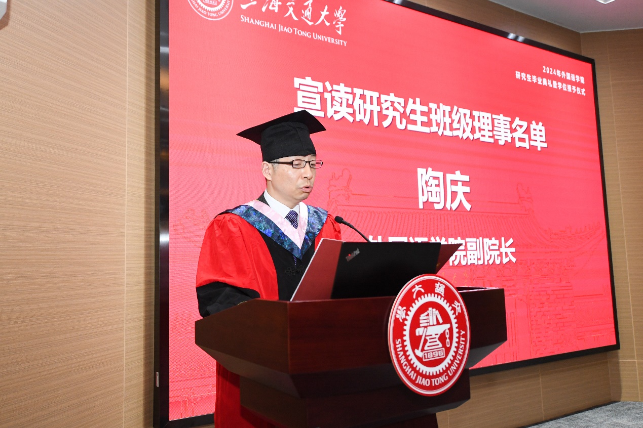On March 27, 2024, the 2024 commencement Ceremony and degree conferring ceremony of the School of Foreign Languages of Shanghai Jiao Tong University was held in the Lecture Hall, No. 300, Young Yongman Building. Ding Jian, SFL's Party Secretary; Chang Hui, SFL's dean; Tao Qing, SFL's vice dean; Shang Biwu, SFL's vice dean; Huan Changpeng, Assistant to the SFL's dean; Xue Yuan, dean of the German Department; Lin Zibo, vice dean of Japanese Department; Guan Xinchao, vice dean of Translation Department attended the event, together with mentor representatives and class teachers such as He Weiwen, Liu Huawen, Wei Xiaofei, Yang Mingming, Zhang Li, Suo Yuhuan, Lai Liangtao, Wang Ping, Li Xin, Lu Xiaojun, Tang Yili, Sang Yuan, Li Siqi as well as SFL's 2024 Spring graduates and some alumni from the 2023 graduates class and their relatives and friends. The ceremony was presided over by Ren Zhujing, SFL's Deputy Party Secretary.