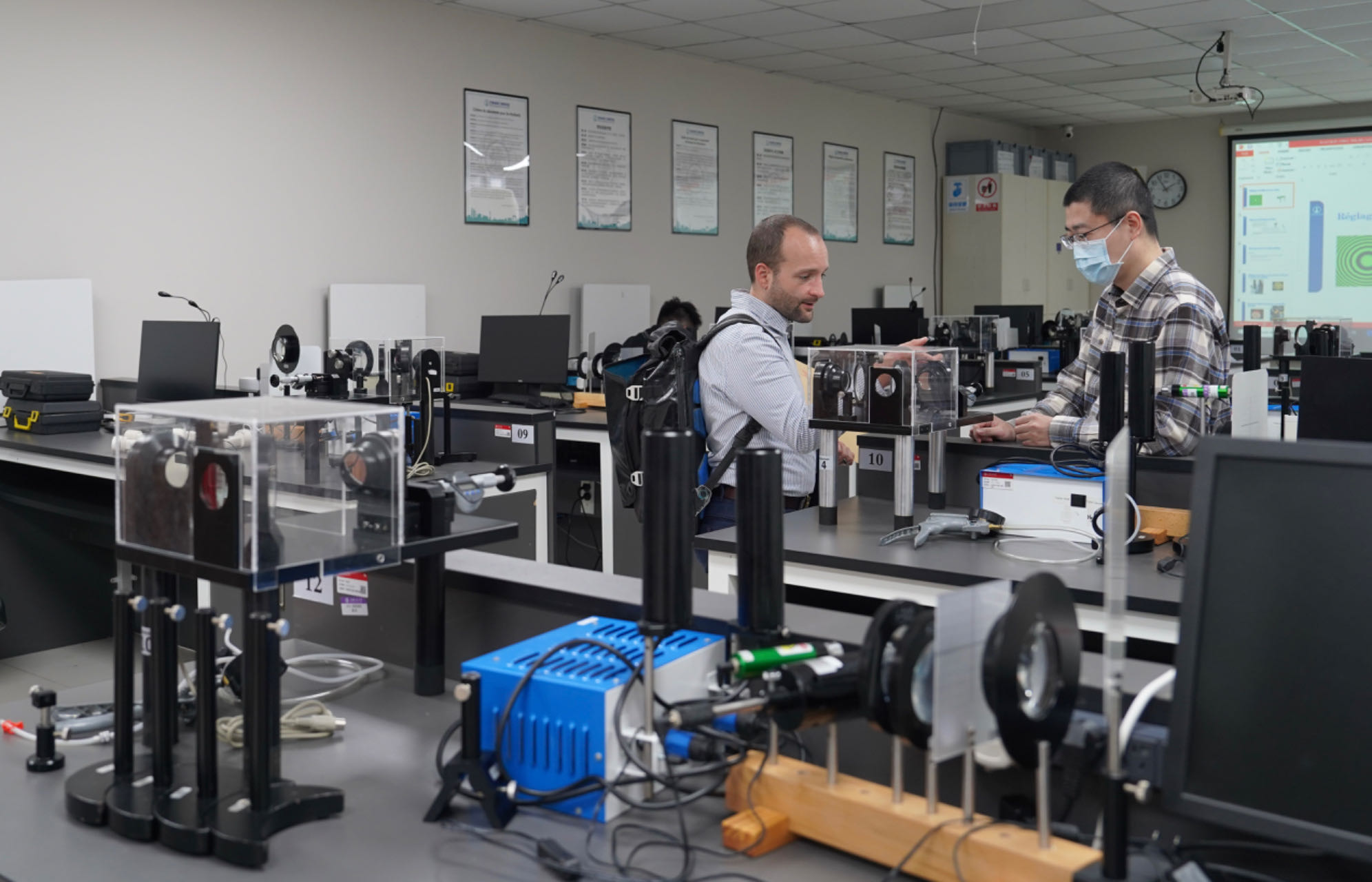 The Optics Laboratory is specialized in conducting optical experiments. The laboratory is equipped with optical experimental instruments such as Michelson interferometer, angle meter, lens optical system, etc. introduced from France. It can conduct experiments to verify optical phenomena such as reflection, refraction, diffraction, interference and related optical principles and laws; measure optical characteristics and properties such as wavelength, frequency, energy, refractive index, transmittance and so on through gratings, lasers and other devices; use lenses, mirrors and other equipment to study a variety of imaging systems; and set up fiber optic communication experimental system to study fiber optic transmission characteristics, light packet switching technology and so on. The laboratory not only undertakes basic optics experimental teaching, but also serves as a research center for group projects.