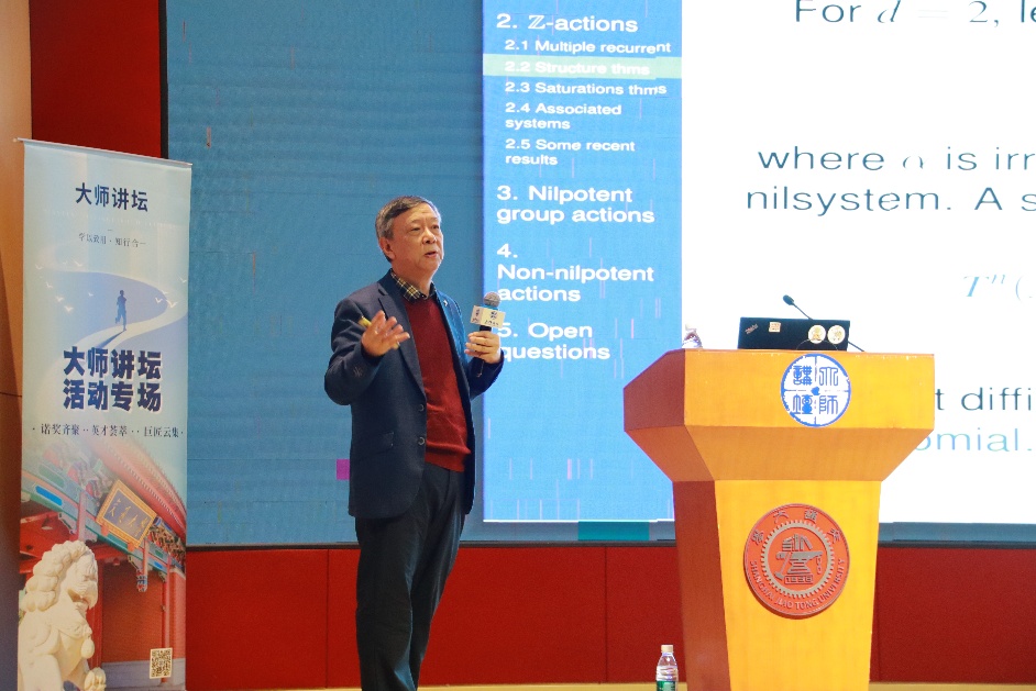 叶向东院士围绕拓扑动力系统与遍历理论中的回复性展开,从Z-actions的多重回复、结构定理与饱和定理讲起,介绍幂零群及非幂零群作用下的复杂性与熵理论,展示其在组合数论中的应用,并穿插团队最新研究进展及若干公开问题,通过例子和图像帮助在场师生理解“平均收敛”等核心思想。最后,他勉励同学们联系实际积极思考,在抽象理论与具体问题之间搭建桥梁,用严谨的数学思维服务前沿科学与工程实践。