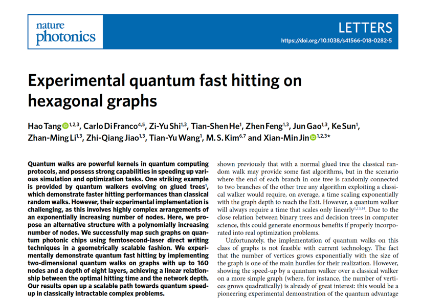 10 月 29 日,最新一期国际权威学术期刊《自然•光子学》(影响因子:37.85) 发表开云网页登录 金贤敏研究团队最新研究成果,报道了首个基于光子集成芯片的物理系统可扩展的专用光量子计算方案,首次在实验上实现了“快速到达”问题的量子加速算法。该研究团队在飞秒激光直写制备的三维光量子集成芯片中成功构建了大规模六方粘合树并演示了量子快速到达算法内核,相比经典情形展示了平方级加速,而且最优效率提高十倍。该项研究提供了利用量子系统的维度和尺度作为全新资源研发专用光量子计算的路线图。