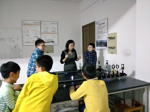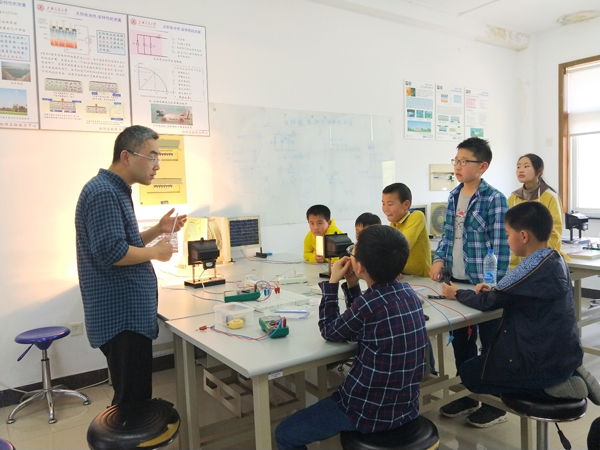 同时,物理实验楼中初中组交二代们在实验中心老师的带领下,感受物理科学的魅力。刘嘉滨老师带领“交二代”们了解太阳能板的发电原理,以及一些基本的电路知识。刘老师通过生动有趣的讲解,巧妙与其他基本常识相结合,并通过手把手教实验,让“交二代”们亲身感受到距离变化对电流电压的影响。