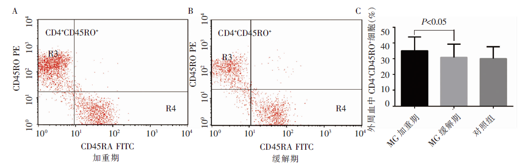 目的:观察全身型重症肌无力(myasthenia gravis, MG)患者血中T淋巴细胞亚群百分比的变化,分析其与患者症状加重或缓解间的关系。方法:采用流式细胞术分别检测51例全身型MG患者在病情加重及缓解的不同时期外周血中T淋巴细胞亚群百分比的变化,分析其与症状波动之间的关系,另设30名健康体检者为对照组。结果:加重期MG患者血中的CD4+CD25+CD127low/-调节性T淋巴细胞和CD4+CD45RA+原始T淋巴细胞百分比均明显低于对照组(5.54%±1.88%比7.95%±3.45%,P<0.05;11.42%±6.97%比 24.98%±7.86%,P<0.05);而MG患者加重期血中的CD4+CD45RO+T淋巴细胞百分比高于缓解期及对照组(35.06%±8.78%比30.82%±8.43%;35.06%±8.78%比30.09%±7.53%,P均<0.05)。采用受试者工作特征曲线(receiver operating characteristic curve,ROC曲线)分析淋巴细胞百分比在MG诊断中的价值,患者血中的CD4+CD25+CD127low/-调节性T淋巴细胞和CD4+CD45RA+T淋巴细胞诊断全身型MG发病的ROC曲线下面积(area under curve,AUC)分别为0.713和0.900(P<0.05);CD4+CD45RO+T淋巴细胞诊断MG症状加重的AUC为0.675,其最佳临界值为32.06%。结论:检测调节性T淋巴细胞和CD4+CD45RA+T淋巴细胞百分比对全身型MG的发病具有一定诊断价值,而CD4+CD45RO+T淋巴细胞百分比与全身型MG患者的症状波动相关,有可能成为衡量其病情变化的标志物。