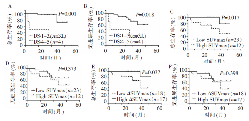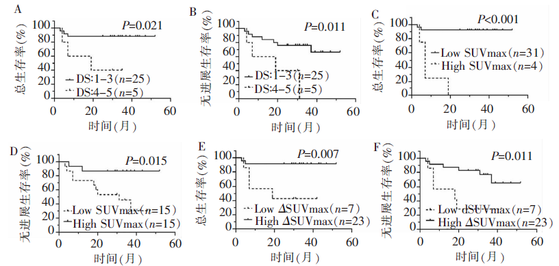 目的:观察18氟-氟代脱氧葡萄糖-正电子发射计算机体层显像(18F-fluorodeoxyglucose-positron emission computed tomography,18F-FDG PET/CT)在评估鼻型结外自然杀伤/T细胞淋巴瘤(extranodal natural killer/T-cell lymphoma, nasal type,ENKTL)治疗预后的价值。方法:回顾性分析2014年10月至2021年6月间在本院就诊并经病理证实的41例新诊断ENKTL患者。所有患者均接受氨甲蝶呤、依托泊苷、地塞米松和培门冬酶(methotrexate, etoposide, dexamethasone and pegaspargase,MESA)方案治疗,记录ENKTL患者治疗前、治疗中期、治疗结束后的18F-FDG PET/CT显像结果,收集指标包括Deauville评分(Deauville score,DS)、最大标准化摄取值(maximal standardized uptake values,SUVmax)和SUVmax变化(ΔSUVmax)。采用单因素和多因素分析以评估这些指标对患者总生存期(overall survival,OS)和无进展生存期(progression-free survival,PFS)的预测价值。结果:本研究中位随访期为45个月(3~64个月),患者2年的总生存率和无进展生存率分别为83.0%±6.0%和76.0%±7.0%,5年的指标分别为61.0%±12.0%和53.0%±10.0%。单因素分析显示,治疗前Ann Arbor 分期(P=0.002),治疗中期DS(P=0.021)、SUVmax(P<0.001)、ΔSUVmax(P=0.007),和治疗结束后DS(P=0.001)、SUVmax (P=0.017)和ΔSUVmax(P=0.037)是治疗后总生存率的预后因素。治疗前Ann Arbor分期(P=0.006)、治疗中期DS(P=0.011)、SUVmax(P=0.015)、ΔSUVmax(P=0.011)和治疗结束后DS(P=0.018)是治疗后PFS的预后因素。多变量分析显示,治疗结束时的DS是无进展生存率的唯一独立预测因子(P=0.019),低DS与高DS的2年无进展生存率分别为90.3%±5.3%和50.0%±25.0%(P=0.018)。结果:ENKTL患者治疗结束时,18F-FDG PET/CT显像的DS是唯一独立预后因素,高DS提示2年无进展生存率低。