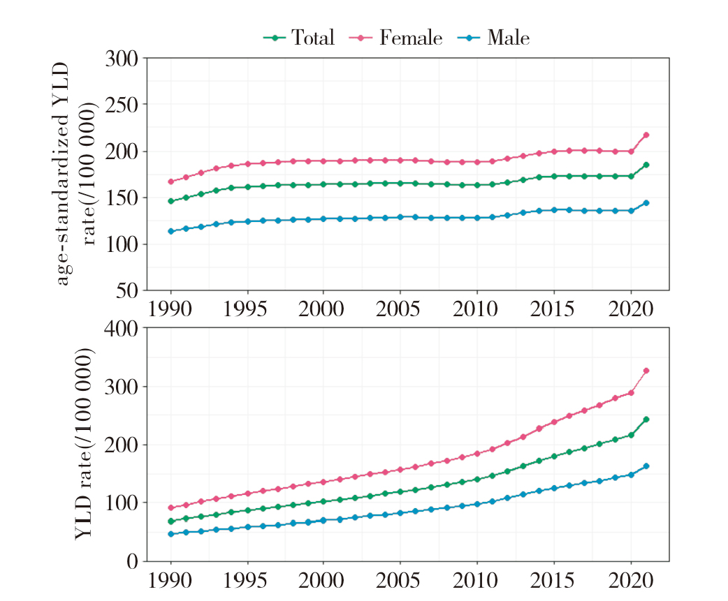 | Gender | YLD(person-years) | YLD rate(/100 000) | As-YLD rate(/100 000) |