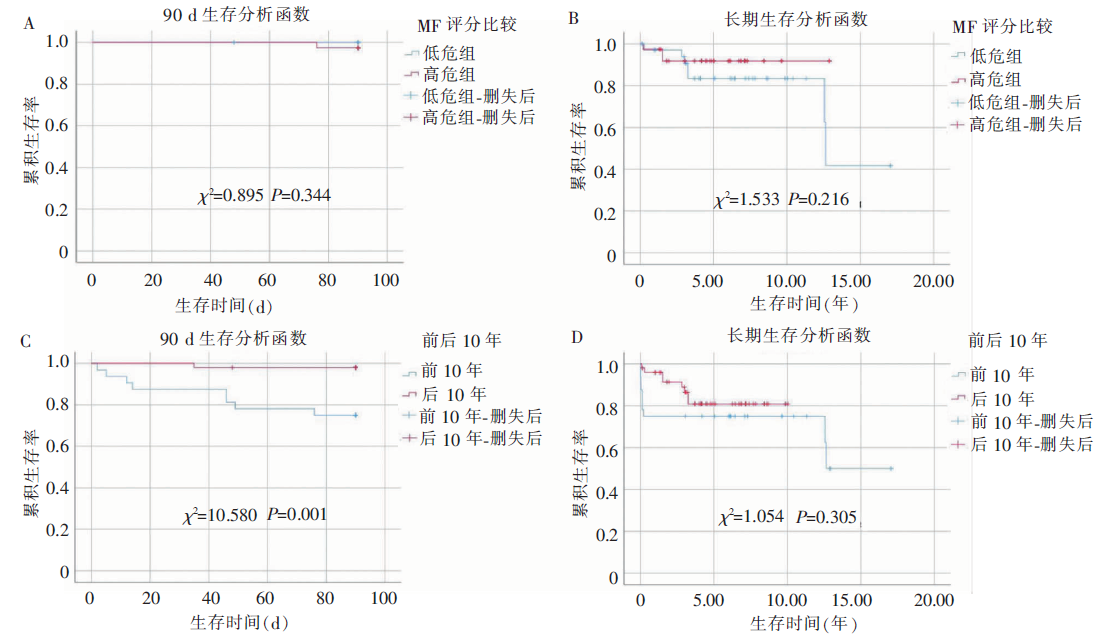 目的:观察肝移植治疗原发性胆汁性胆管炎(primary biliary cholangitis, PBC)的疗效及预后。方法:回顾性分析开云网页登录 医学院附属瑞金医院和上海长征医院2001年1月至2020年12月收治肝移植治疗PBC病人的临床资料。术前免疫炎症反应采用10个免疫炎症指标,包括全身免疫炎症指数、纤维蛋白原以及中性粒细胞、淋巴细胞、单核细胞、血小板、天冬氨酸转氨酶、CD4、CD8之间的比值。根据单核细胞与淋巴细胞的比值以及纤维蛋白原计算、得到评分。评分≥-0.12为高危组,<-0.12为低危组。生存率分析采用寿命表法。多因素分析采用二元Logistic回归模型和COX 回归分析。结果:82例纳入研究。术后随访至2021年12月31日,时间4.54年(2 d~17.06年)。全部PBC肝移植病人的1、3、5、10、15年生存率为85%、79%、79%、79%、47%。中位生存期为12.92年。多因素分析显示,术前天冬氨酸转氨酶与血小板比值是影响PBC肝移植病人90 d生存的独立危险因素(P=0.013);术前单核细胞与淋巴细胞比值和术前纤维蛋白原是影响PBC病人肝移植术后住院时间的独立危险因素(P=0.002;P=0.007)。高危组总住院时间和住院费用都较低危组明显升高。结论:术前免疫炎症反应可能影响PBC肝移植病人的近期预后。