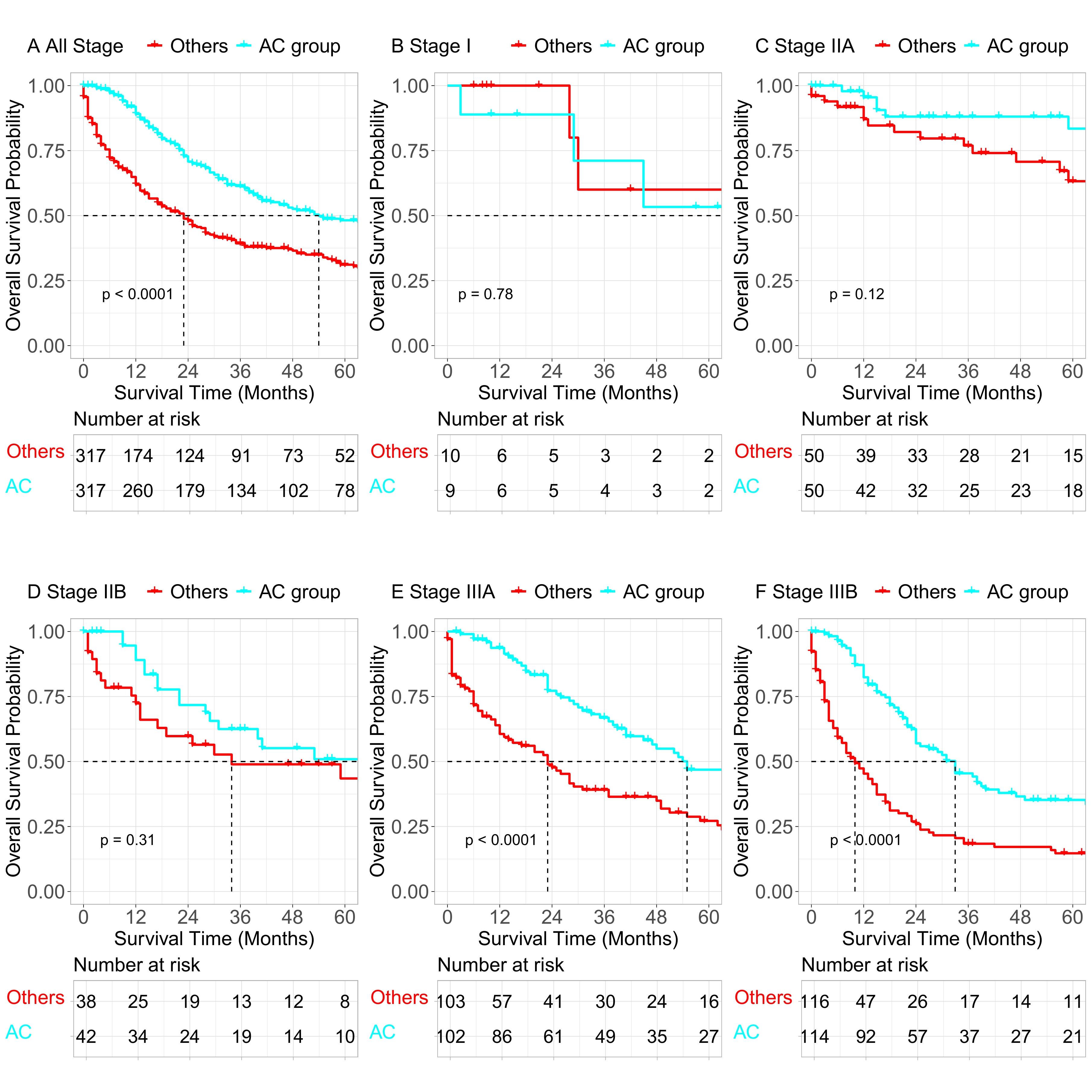 目的: 探讨辅助化疗在不同分期的十二指肠腺癌(DAC)病人中的有效性。方法: 研究对2000年1月至2021年12月之间在SEER数据库中诊断为DAC的病人进行回顾性分析。使用Kaplan-Meier曲线分析辅助化疗对不同分期DAC生存率的影响。采用单因素和多因素COX回归分析确定辅助化疗是否为影响癌症特异生存(CSS)和总生存(OS)的独立预后因素。结果: 共有1 195例符合纳入标准的病人纳入研究。其中,620例(51.9%)术后接受辅助化疗,定义为辅助化疗组,575例(48.1%)仅接受手术,定义为其他组。经倾向性评分匹配后,共634例纳入后续分析。亚组分析表明,ⅢA期和ⅢB期辅助化疗组与其他组病人CSS和OS差异有统计学意义(P<0.05),Ⅰ期、ⅡA期、ⅡB期辅助化疗组与其他组病人CSS和OS差异均无统计学意义(P>0.05)。多因素分析表明,辅助化疗是影响DAC病人CSS和OS的独立保护因素。此外,年龄、诊断年份、肿瘤分级、区域淋巴结检出数(RNE)、TNM分期也是CSS和OS的独立保护或危险因素(P<0.05)。结论: 根据分期分层分析,DAC病人辅助化疗的生存获益如下:ⅢA和ⅢB期的病人CSS和OS均获益,Ⅰ、ⅡA、ⅡB期病人CSS或OS均无法获益。